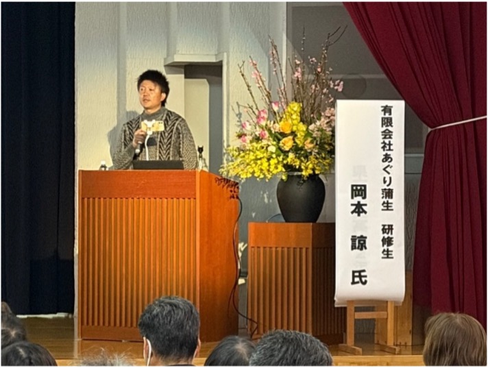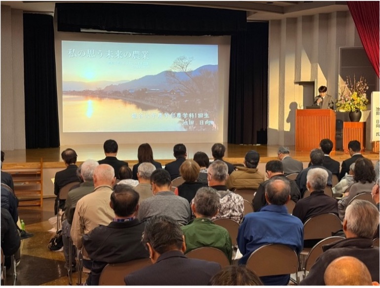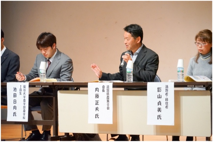 高島農業の課題である「担い手確保」や「後継者対策」について、県内での取組み事例として(有)アグリ蒲生で研修され新規就農される方や地元高校生、大学生の思いを基調講演していただきました。